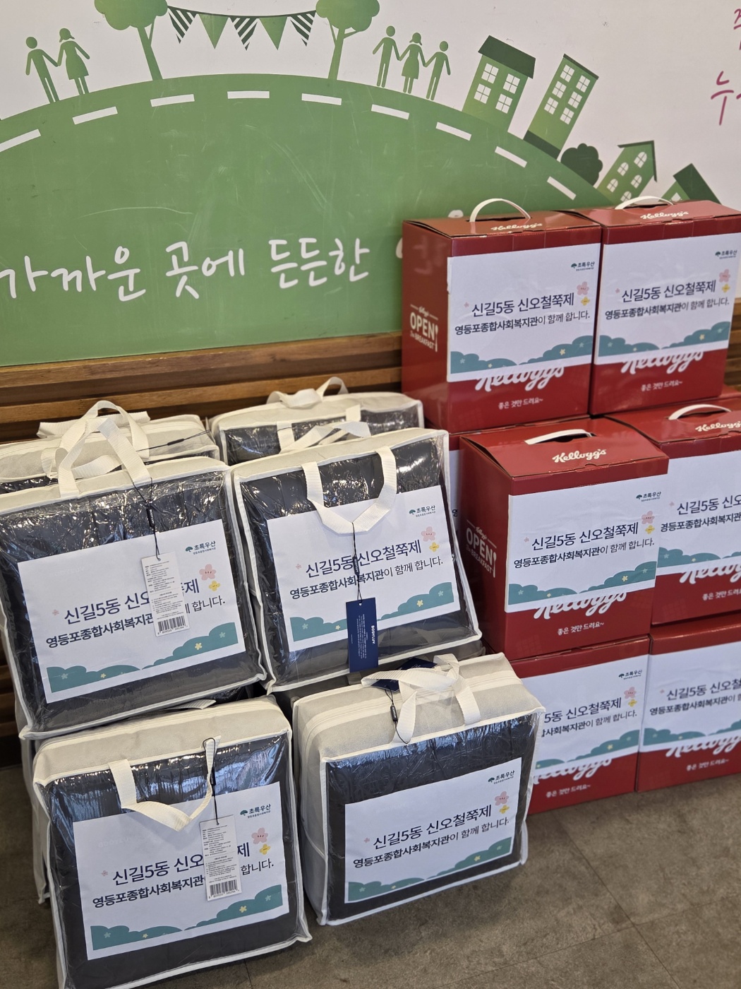 후원받은 '농심' 캘로그 세트, 도톰한 패드(이불) 각 10개를