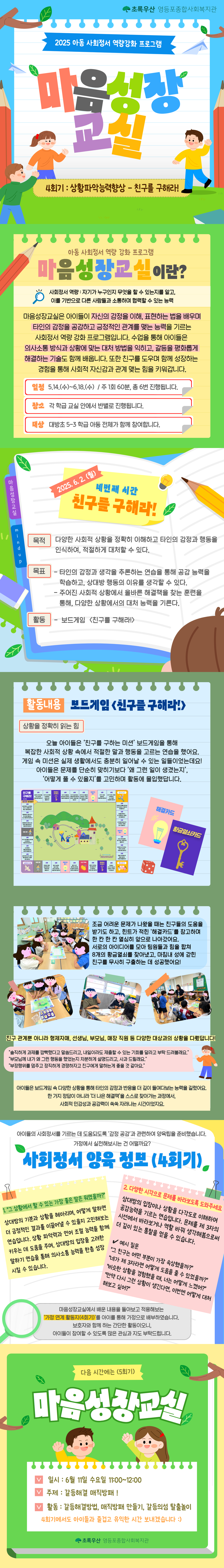 아이들이 학교와 가정에서 마주하는 다양한 사회적 상황을 올바르게 파악하고, 그에 적절히 대처하는 방법을 배우도록 도왔습니다. 실생활에서 자신감을 가지고 사회적 상황을 이해하며 대처할 수 있도록 다채로운 활동을 준비했는데요!