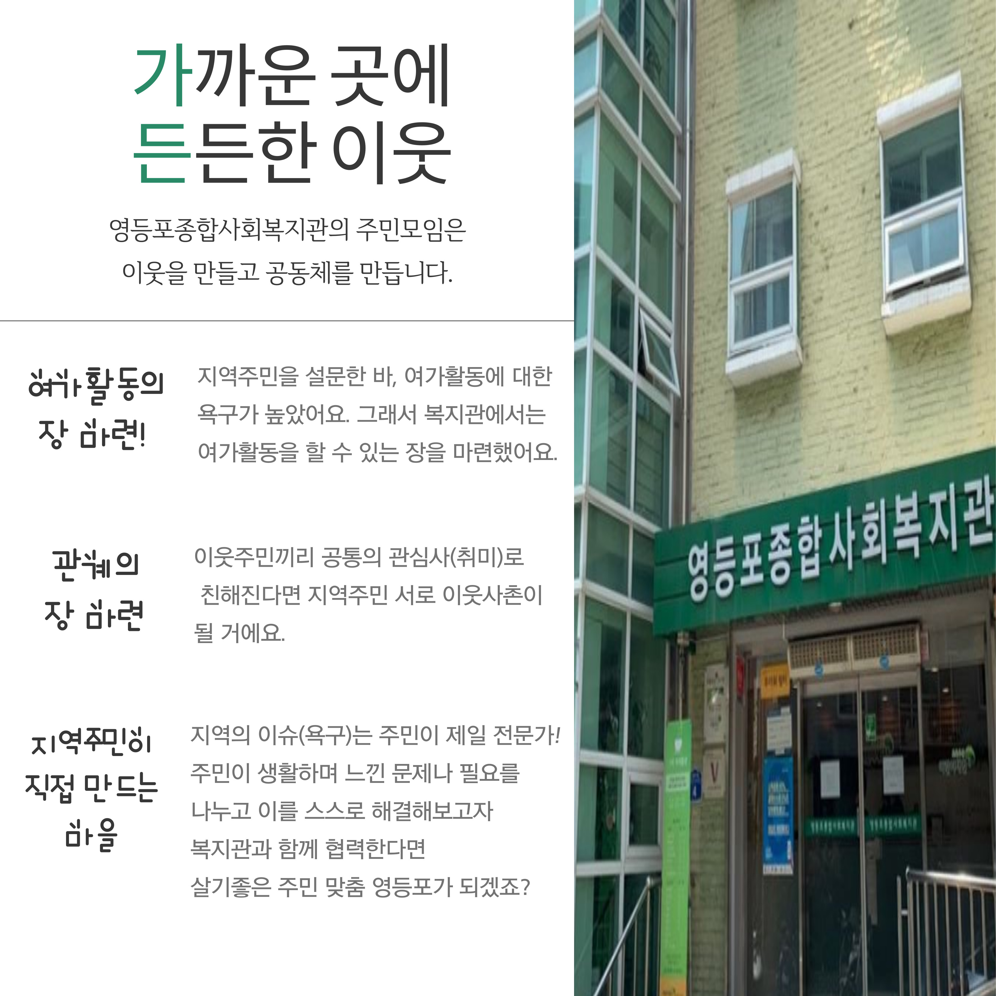 영등포종합사회복지관과 주민이 함께하는 다양한 소식을 알려드립니다.