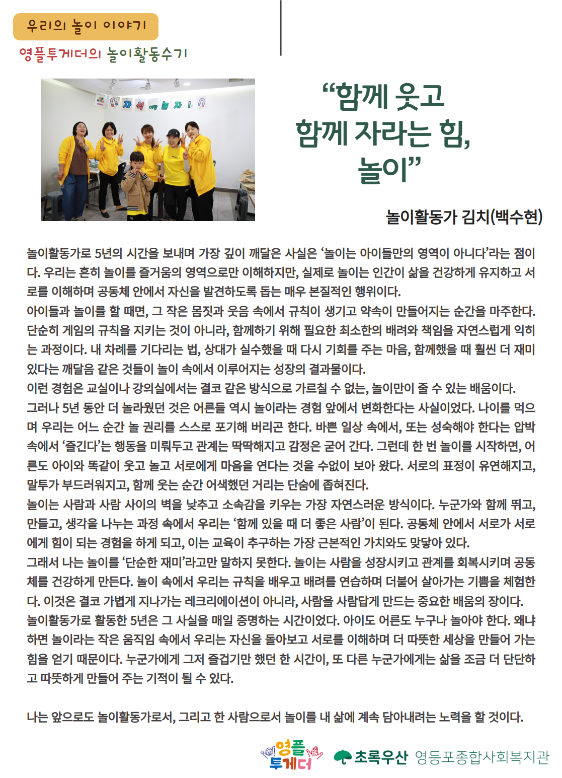 아래에 공유되는 놀이활동 수기를 통해 영플투게더의 한 해를 함께 살펴보시고, 현장에서 애써 주신 놀이활동가들에게 따뜻한 응원과 감사의 마음을 전해주시기 바랍니다.
