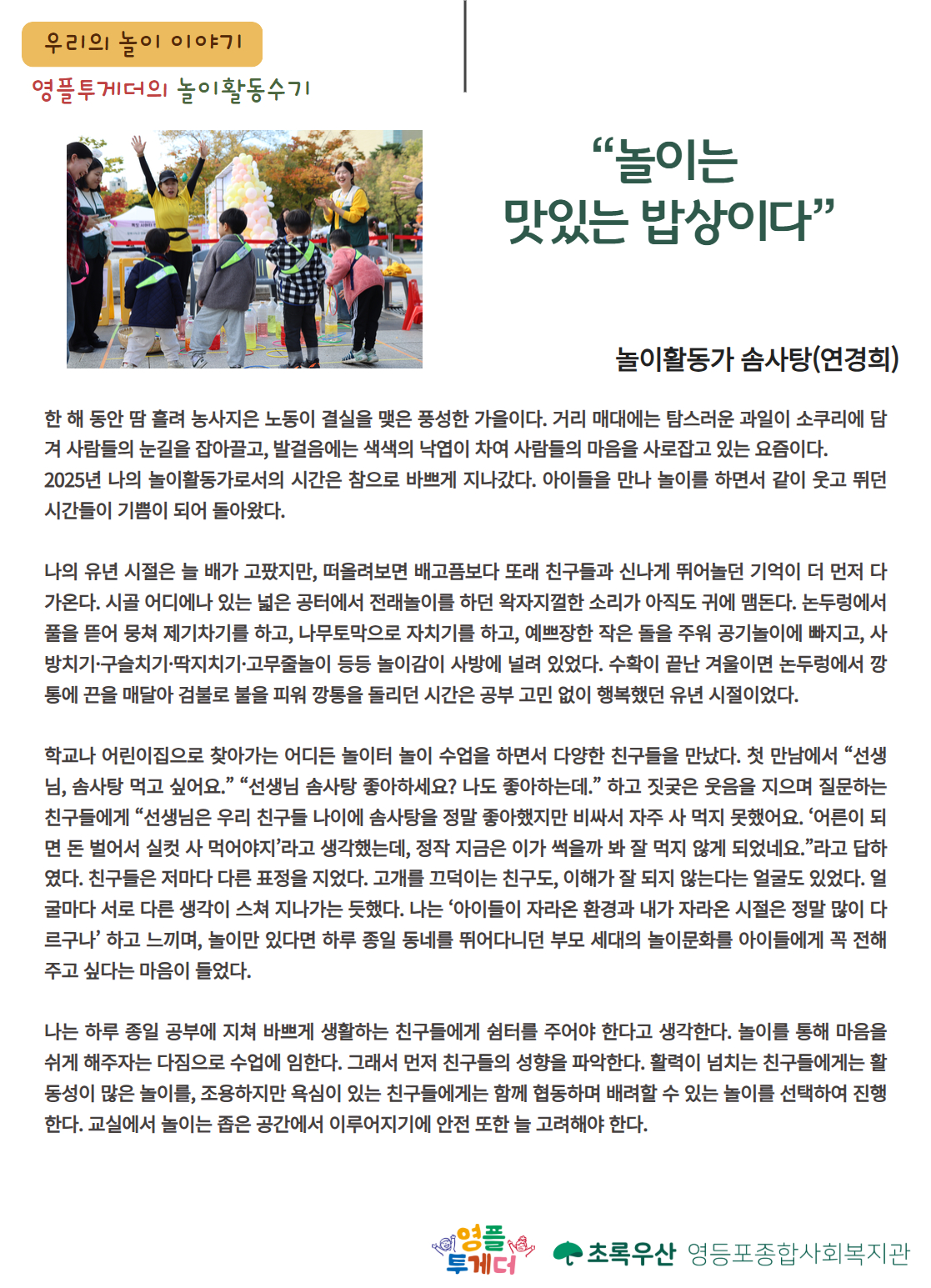 2025년 한 해 동안 영등포 지역 아동의 놀 권리 증진을 위해 함께해 온 영플투게더의 활동을 돌아보며, 올 한 해의 의미를 나누고자 합니다.