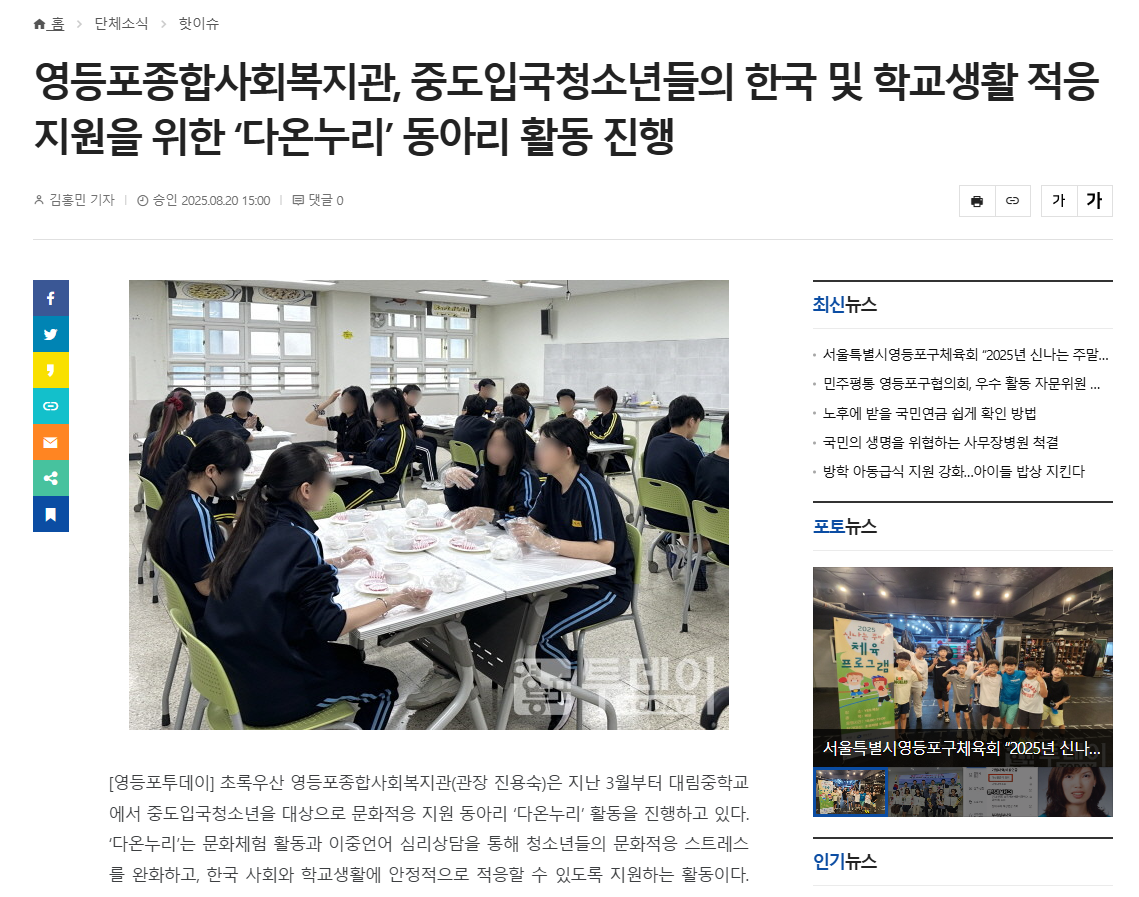 [영등포투데이, 영등포시대] 영등포종합사회복지관, 중도입국청소년들의 한국 및 학교생활 적응 지원을 위한 ‘다온누리’ 동아리 활동 진행