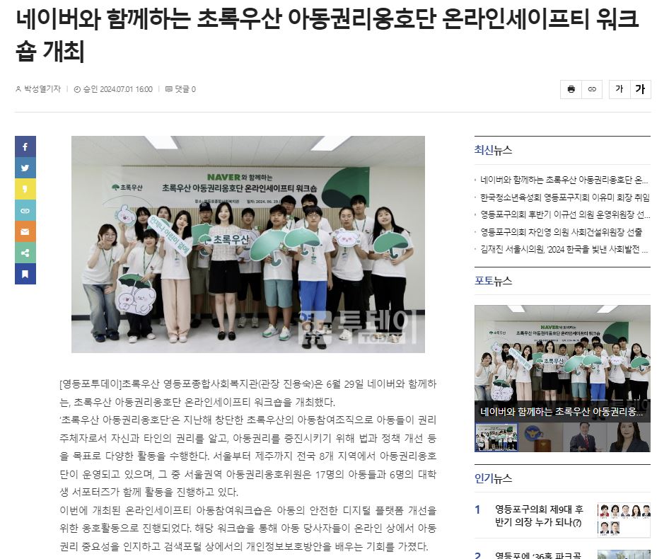 [영등포투데이] 네이버와 함께하는 초록우산 아동권리옹호단 온라인세이프티 워크숍 개최