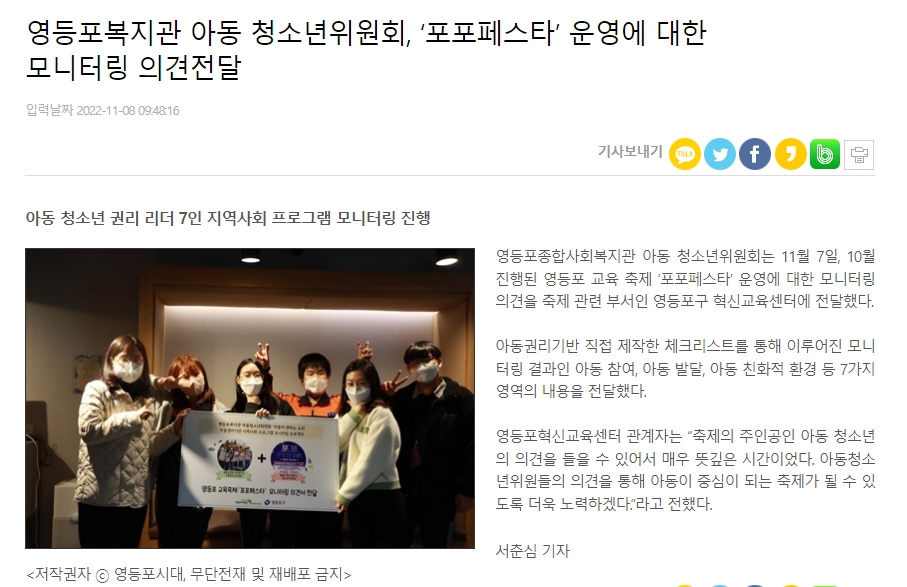 【영등포투데이, 영등포시대】영등포복지관 아동청소년위원회, 지역사회 프로그램 아동권리기반 모니터링 의견 전달