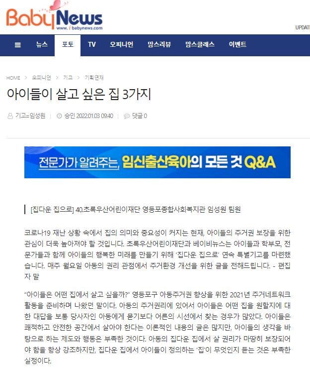 【베이비뉴스】아이들의 위기를 희망으로, 긴급임시주택의 필요성