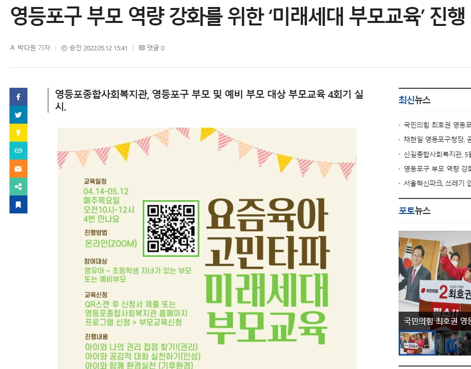 【영등포투데이, 영등포신문】영등포종합사회복지관, 영등포구 부모 역량 강화를 위한 '미래세대 부모교육' 진행