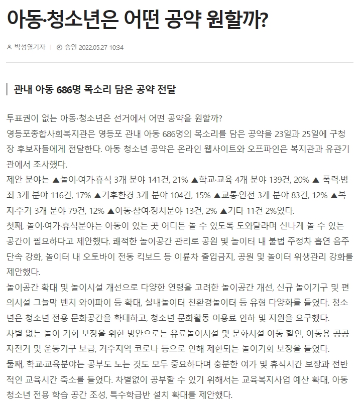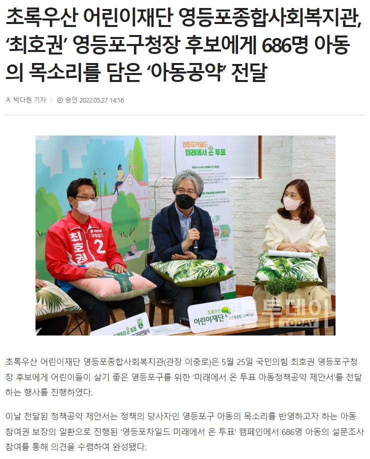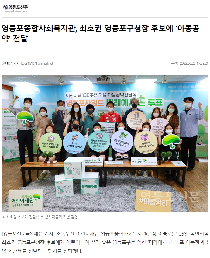 【영등포신문】영등포종합사회복지관, '최호권, 채현일' 영등포구청장 후보에게 686명 아동의 목소리를 담은 '아동공약' 전달