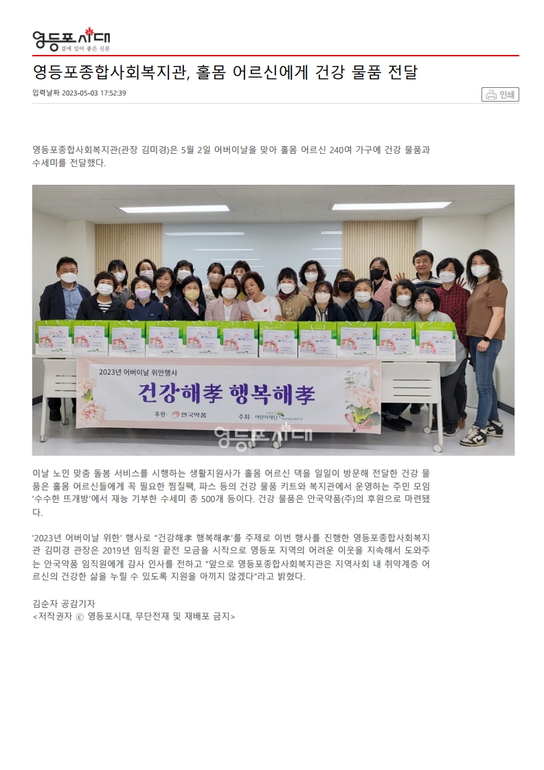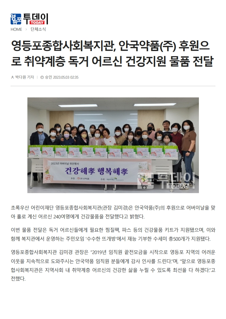 【영등포신문, 영등포투데이, 영등포시대 】 영등포종합사회복지관, 안국약품(주) 후원으로 취약계층 독거 어르신 건강지원 물품 전달