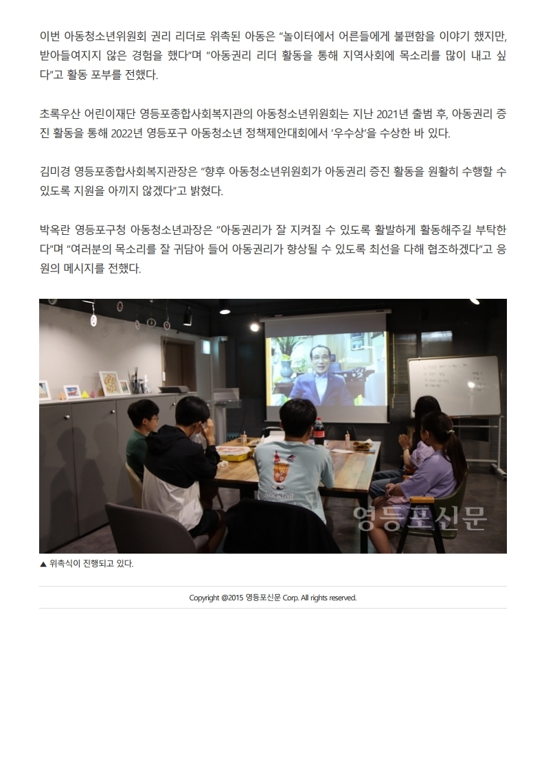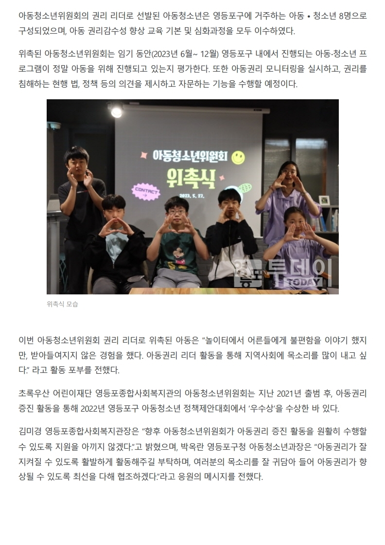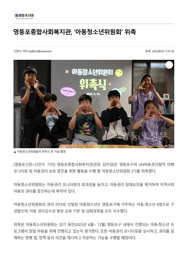 【 영등포신문, 영등포투데이 】 영등포종합사회복지관, ‘아동청소년위원회’ 위촉