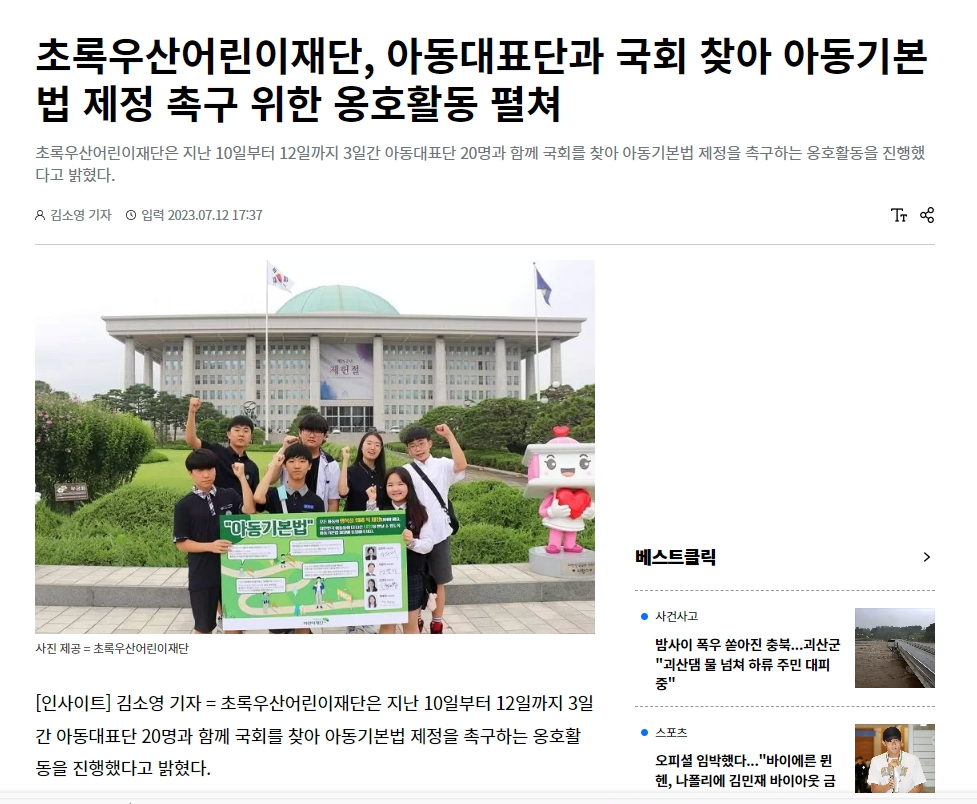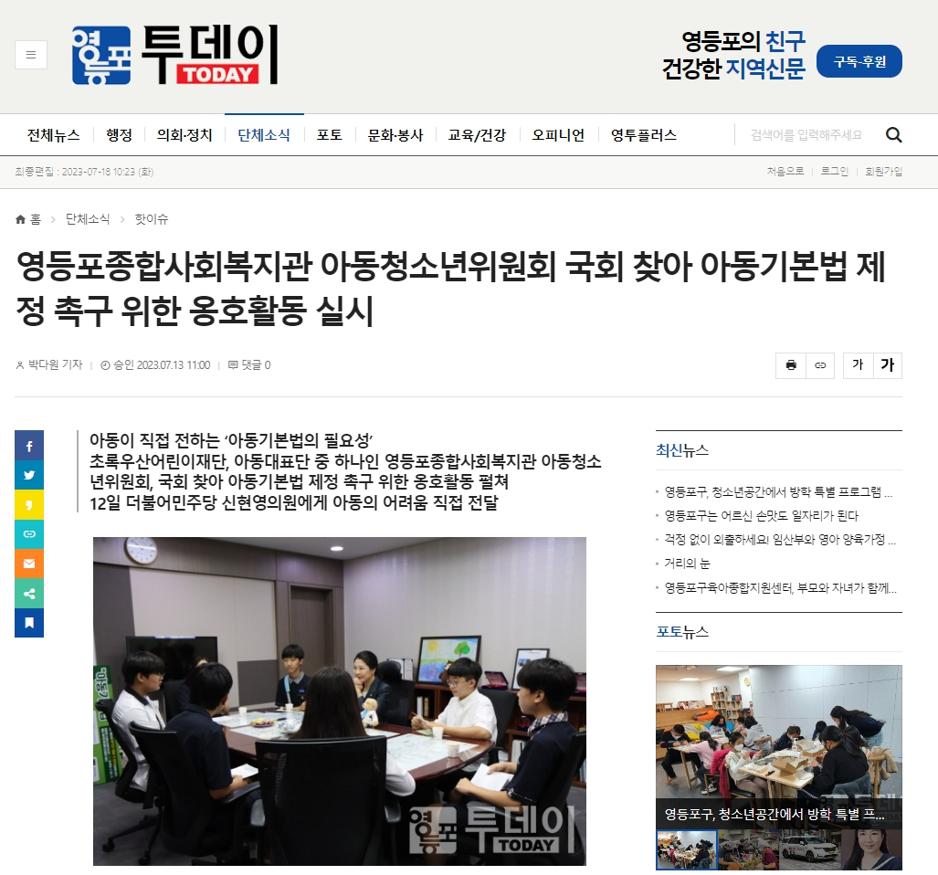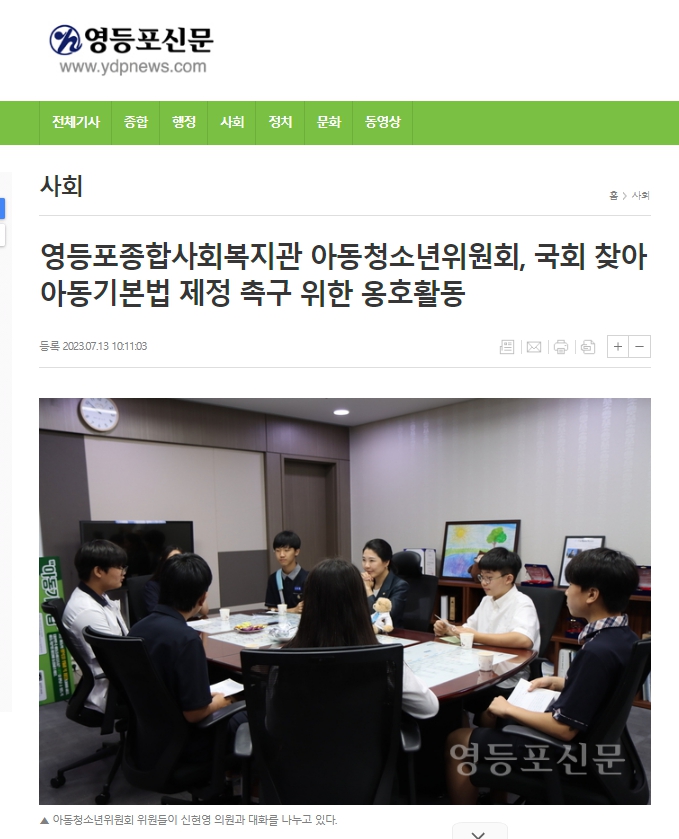 【중앙일보, 인사이트, 영등포신문, 영등포 투데이 등 아동청소년위원회 아동기본법 제정 촉구 활동
