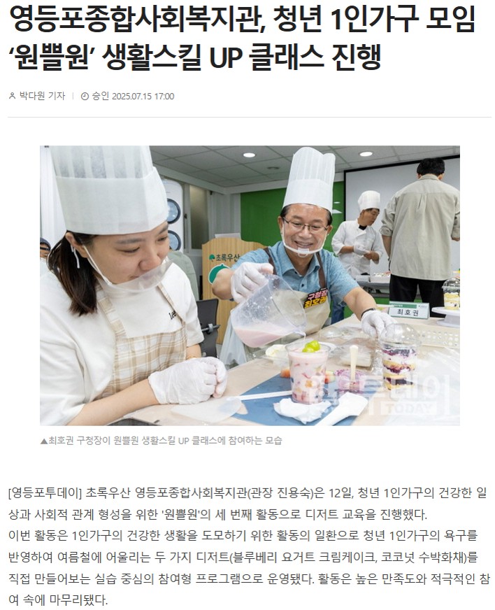 [영등포투데이, 영등포신문] 영등포종합사회복지관, 청년 1인가구 모임 ‘원쁠원’ 생활스킬 UP 클래스 진행