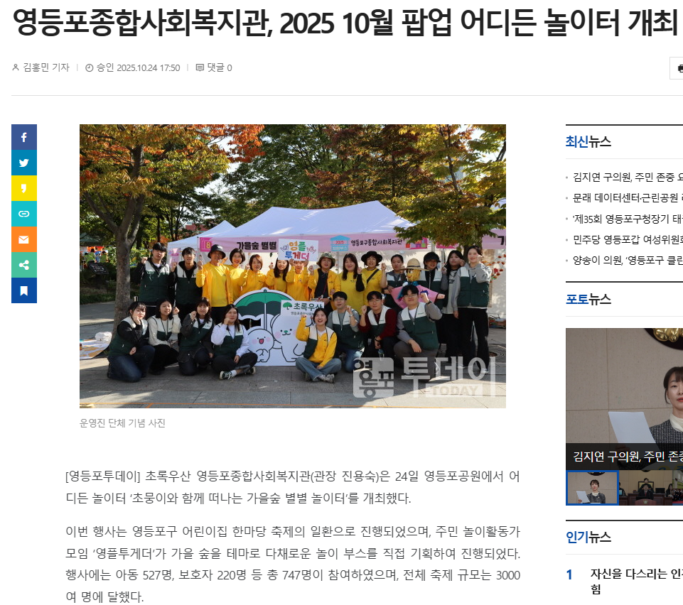 [영등포투데이] 영등포종합사회복지관, 2025 10월 팝업 어디든 놀이터 개최