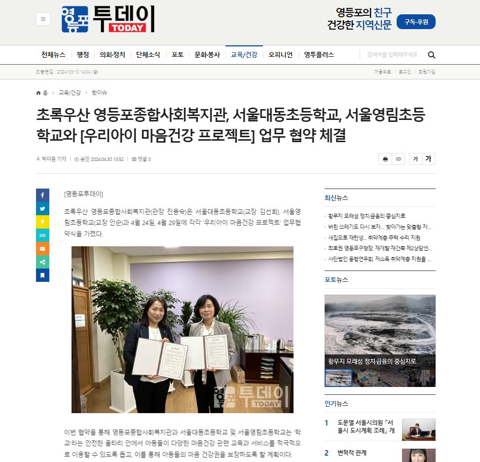 초록우산 영등포종합사회복지관, 서울대동초등학교, 서울영림초등학교와 [우리아이 마음건강 프로젝트] 업무 협약 체결