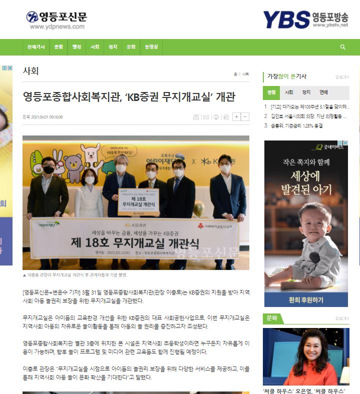 【영등포신문】영등포종합사회복지관 KB증권 무지개교실 개관