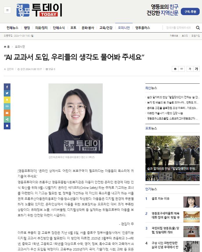 [영등포투데이] “AI 교과서 도입, 우리들의 생각도 물어봐 주세요”