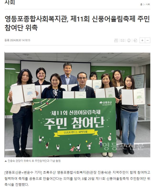 [영등포투데이, 영등포신문] 초록우산 영등포종합사회복지관, 제 11회 신풍어울림축제 주민참여단 위촉