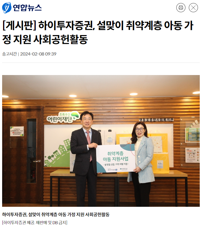 【연합뉴스 등】하이투자증권, 설맞이 취약계층 아동 가정 지원