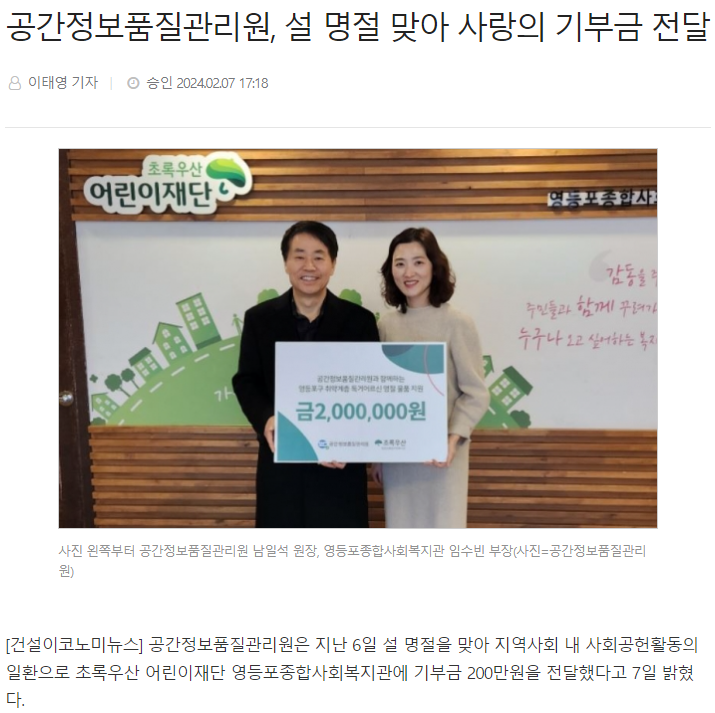 【건설이코노미】공간정보품질관리원, 설 명절 맞아 사랑의 기부금 전달