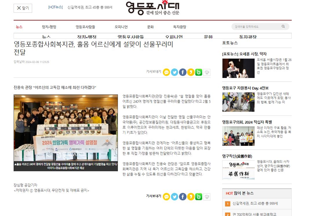 【영등포시대,영등포신문,영등포투데이】영등포종합사회복지관 ‘설맞이 독거 어르신 선물꾸러미 나눔’