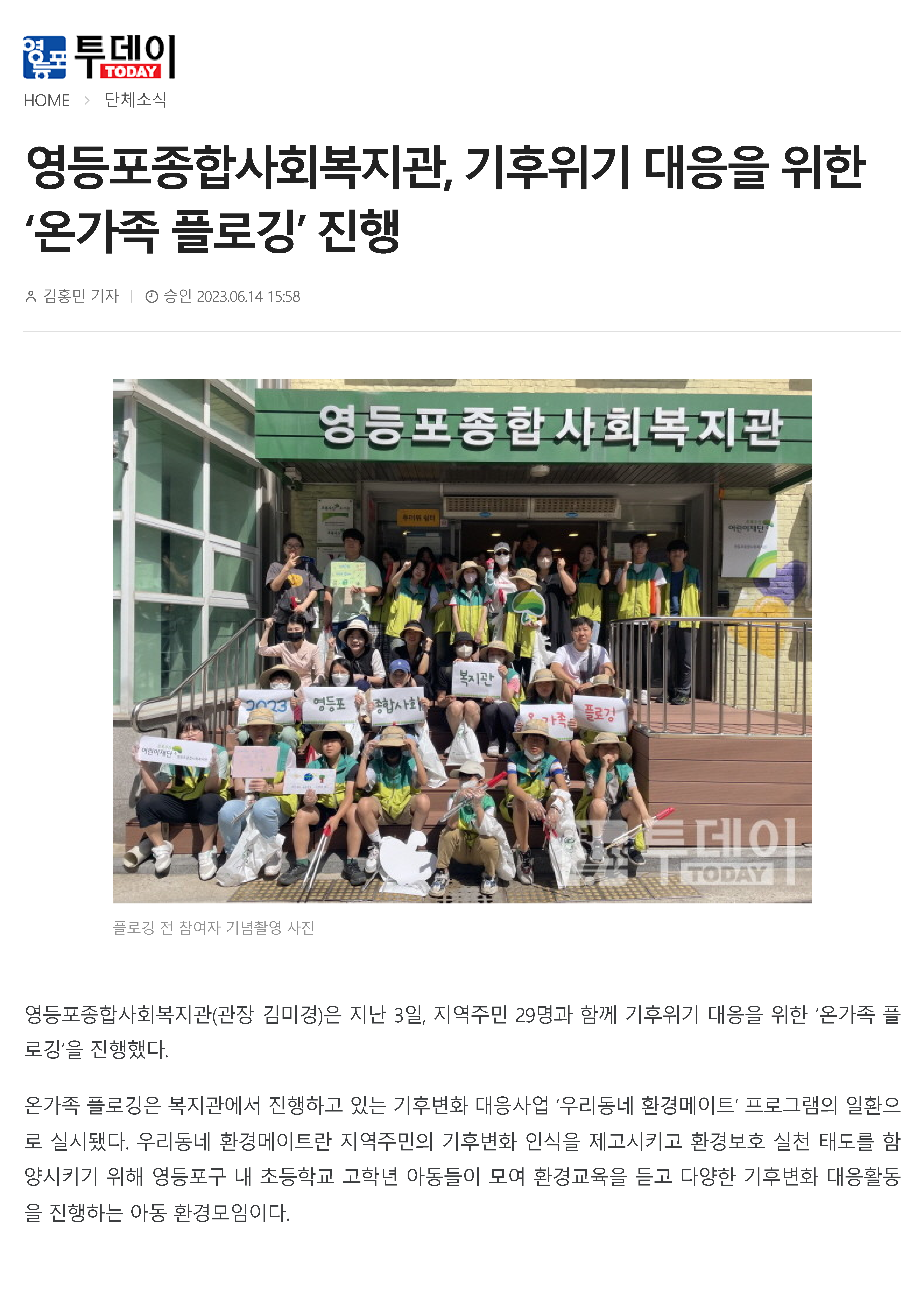 【영등포투데이】영등포종합사회복지관, 기후위기 대응을 위한 ‘온가족 플로깅’ 진행